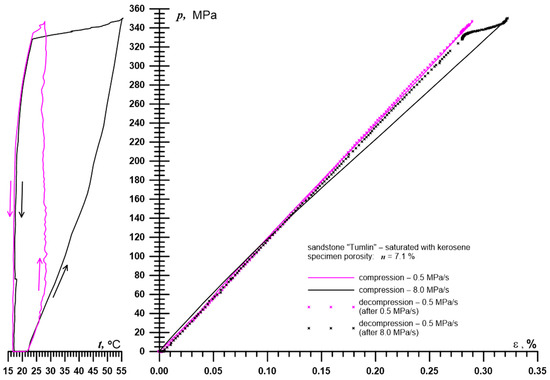 Example of a compressibility test result (for a detailed description of this type of test, see [49]);. P—hydrostatic pressure in the high-pressure cell, ε—linear deformation of the sample, t—temperature in the high-pressure cell. Volume change in the sample e = 3ε. Arrows’ description: ↑↑—compression, ↓↓—decompression.