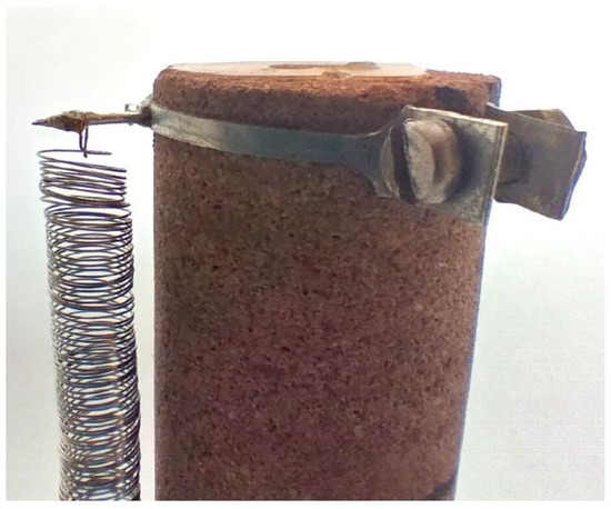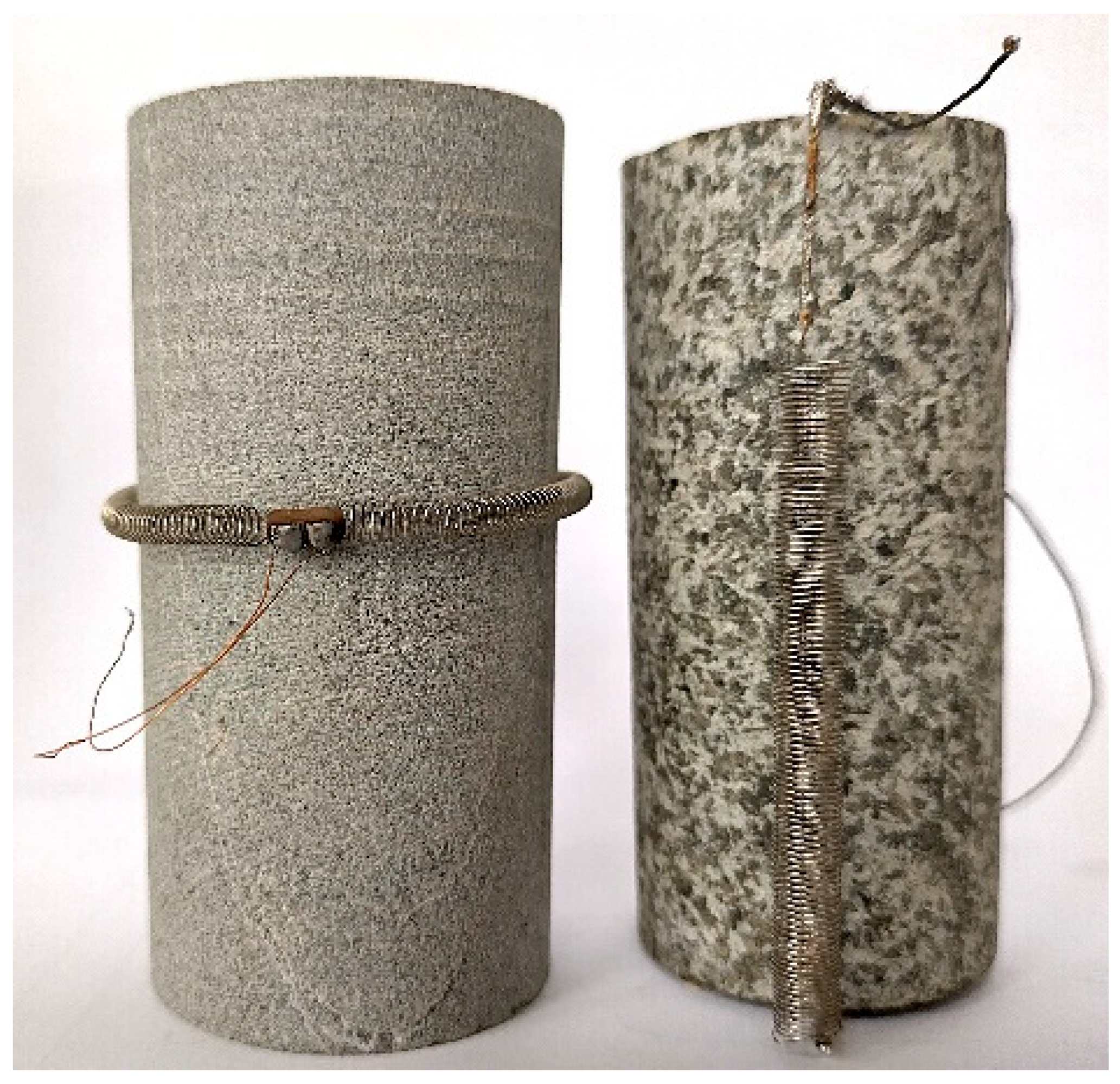 Figure 1 presents two versions of the sensor. On the left, the sensor is shown in the form of a torus encircling the sample at mid-height, used to measure the circumferential deformation of the sample in the conventional triaxial compression test. On the right, the sensor is shaped like a simple spring soldered to metal clamps, which are attached to the tested sample. In this configuration, the sensor is used during the compressibility test.