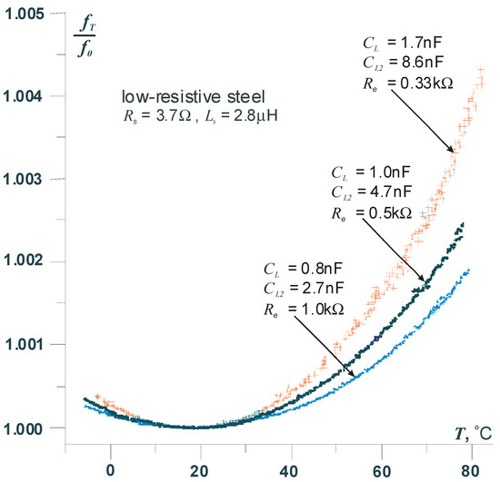 By selecting appropriate capacitor values, it is possible to achieve compensation of the temperature effect on the frequency within the temperature range in which the measurement is performed. The key to achieving thermal compensation lies in modifying the resonant circuit by adding a capacitor CL, which shunts the capacitive divider C1, C2 (see Figure 1). Detailed information on this compensation method is provided in [11,12]. It should be emphasized that the influence of temperature changes on the sensor outside the compensation point will increase, which is a direct consequence of the parabolic dependence of the frequency on the sensor temperature. To minimize this effect, for example, in measurements requiring very high precision, the use of a reference sensor is necessary. To illustrate the above issue, Figure 7 shows the thermal characteristic of the transducer operating in the modified resonant circuit.