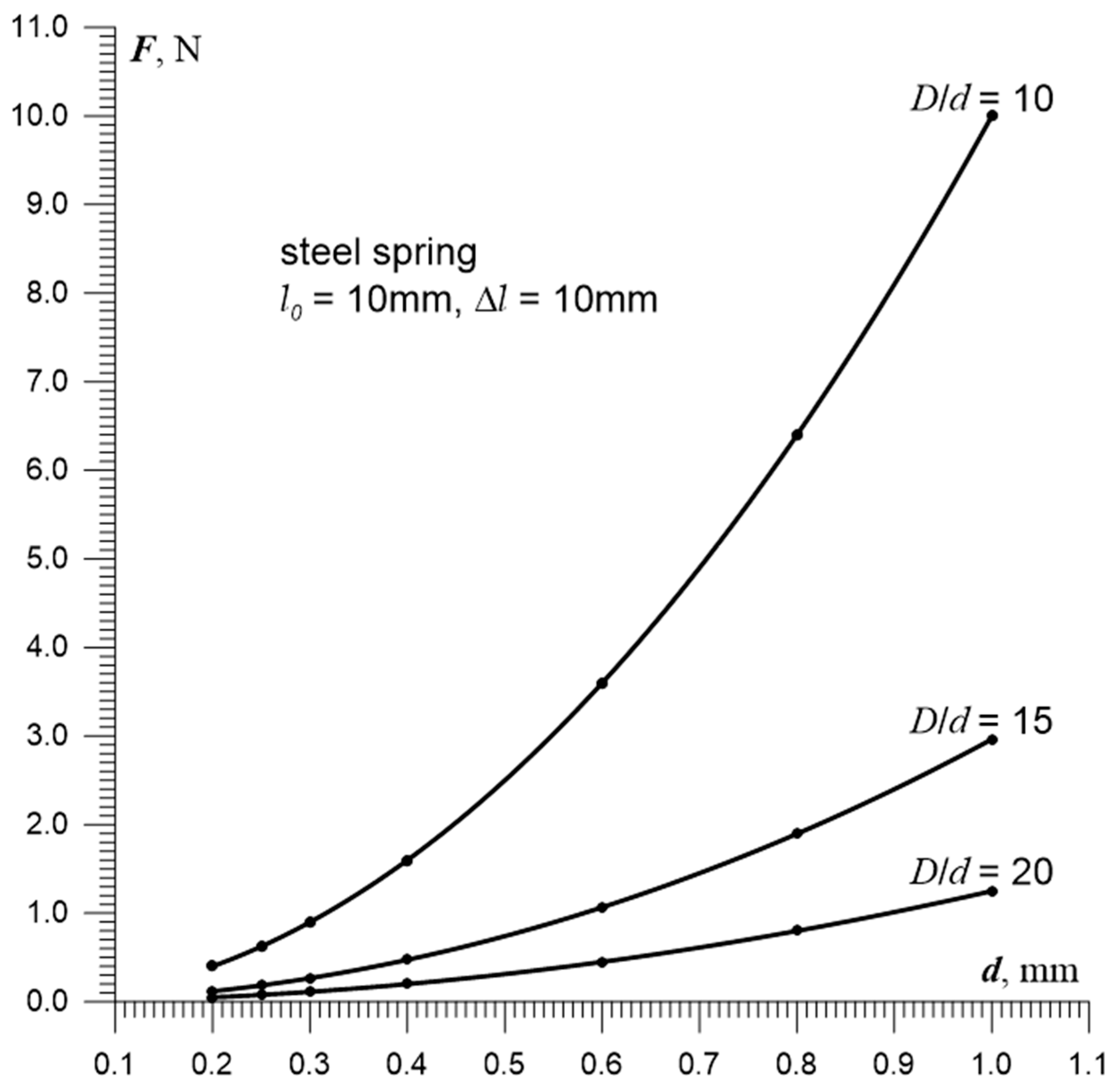 Figure 5 presents the relationship between the tension force of a steel spring and the wire diameter, derived from Equation (21). Calculations were performed assuming: