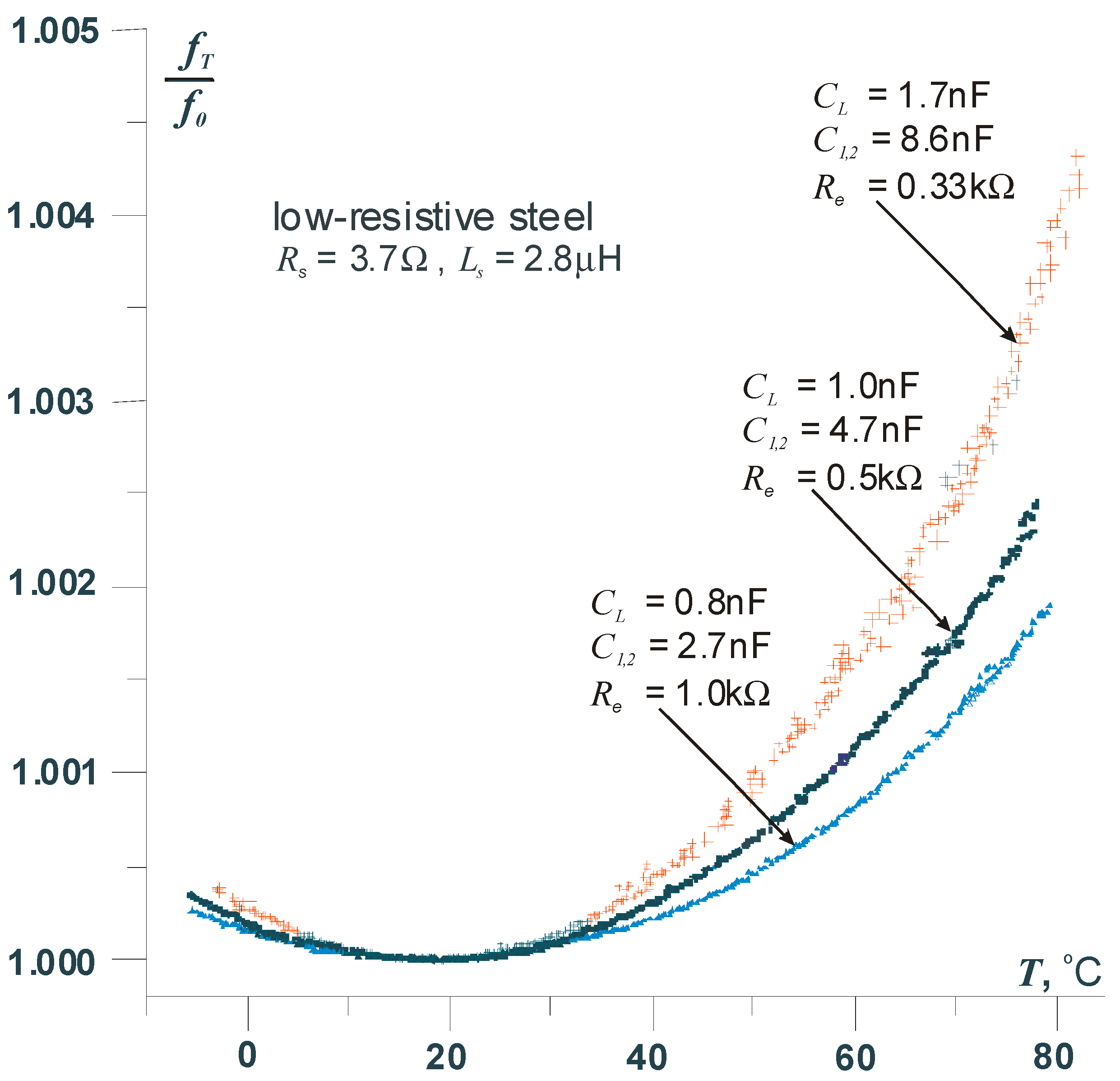 By selecting appropriate capacitor values, it is possible to achieve compensation of the temperature effect on the frequency within the temperature range in which the measurement is performed. The key to achieving thermal compensation lies in modifying the resonant circuit by adding a capacitor