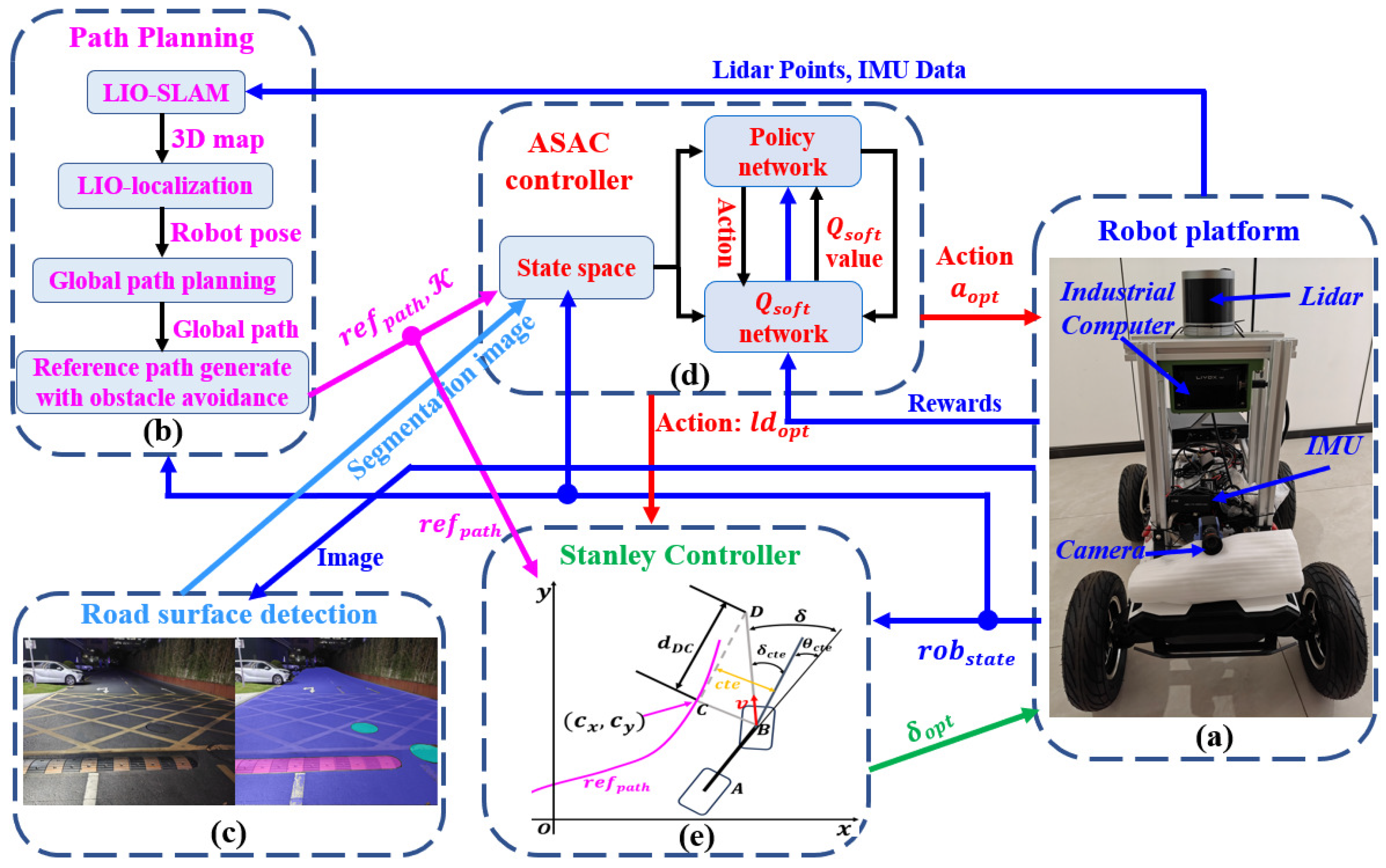 Leveraging the powerful learning capability of the ASAC algorithm, the proposed approach better represents the vehicle’s dynamic model and incorporates road surface information to enable road surface perception. This allows the robot to slow down in advance on slippery roads and increase its driving speed on dry and normal roads, thereby ensuring safety and improving movement efficiency.
