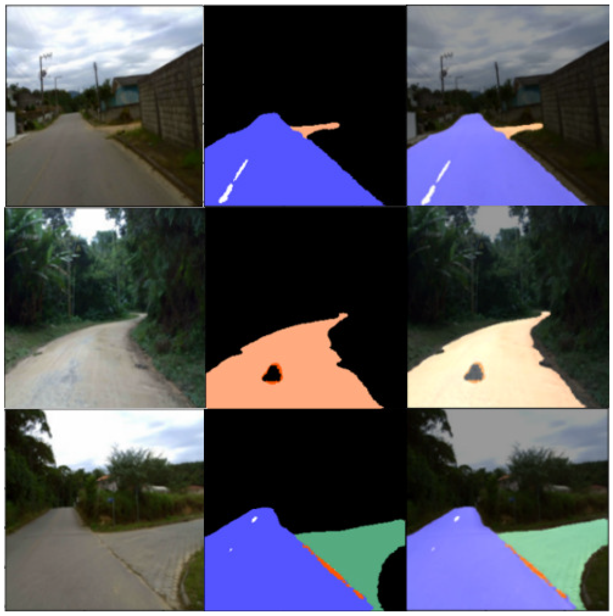Figure 3. The original image is shown on the left, and the prediction results are in the middle, where different road types are represented as color images generated by the network, each corresponding to a specific road category. The rightmost part displays the detection result after the prediction output is mapped onto the original image with the background removed. The total number of parameters in the network is 1,941,309. The input image size is