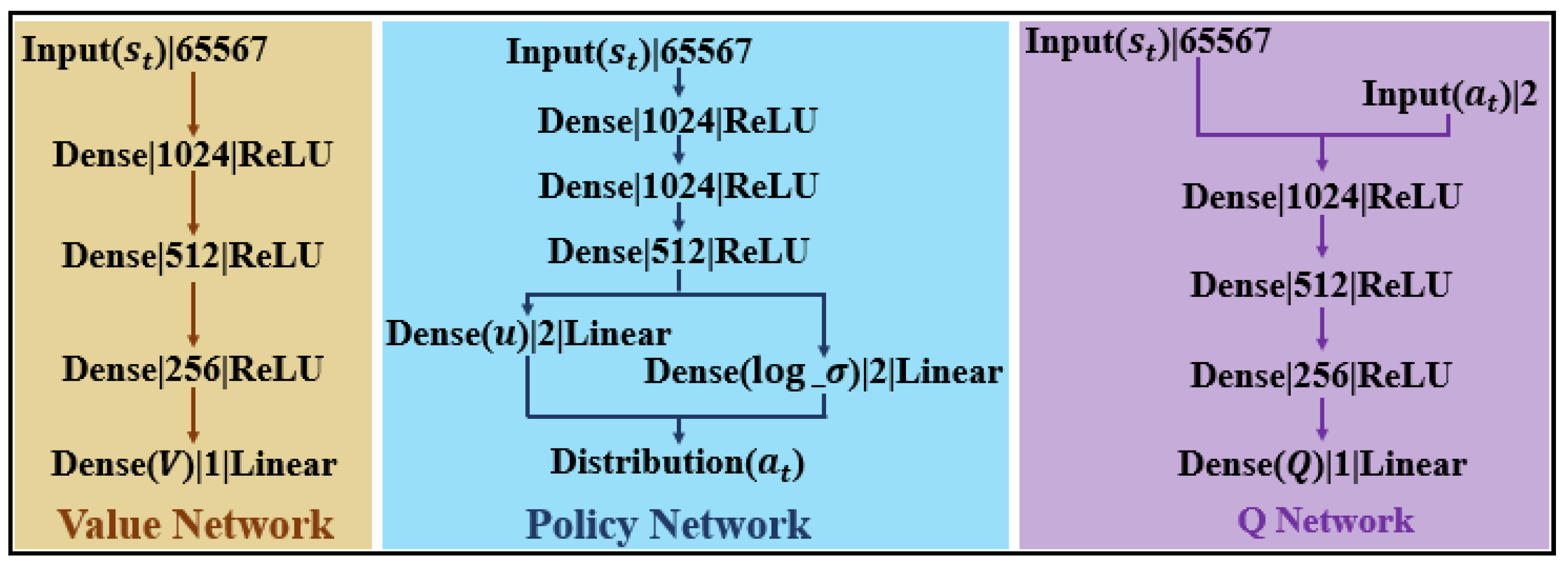 Figure 4 shows the network structure, including the input types, output dimensions, and the corresponding activation functions of each layer. “Linear” indicates a direct linear output without an activation function, while “Dense” refers to a fully connected layer. We use the Q value as the critic and update the network parameters using temporal difference learning. The update equations for the critic and actor are given by (9) and (10), respectively.