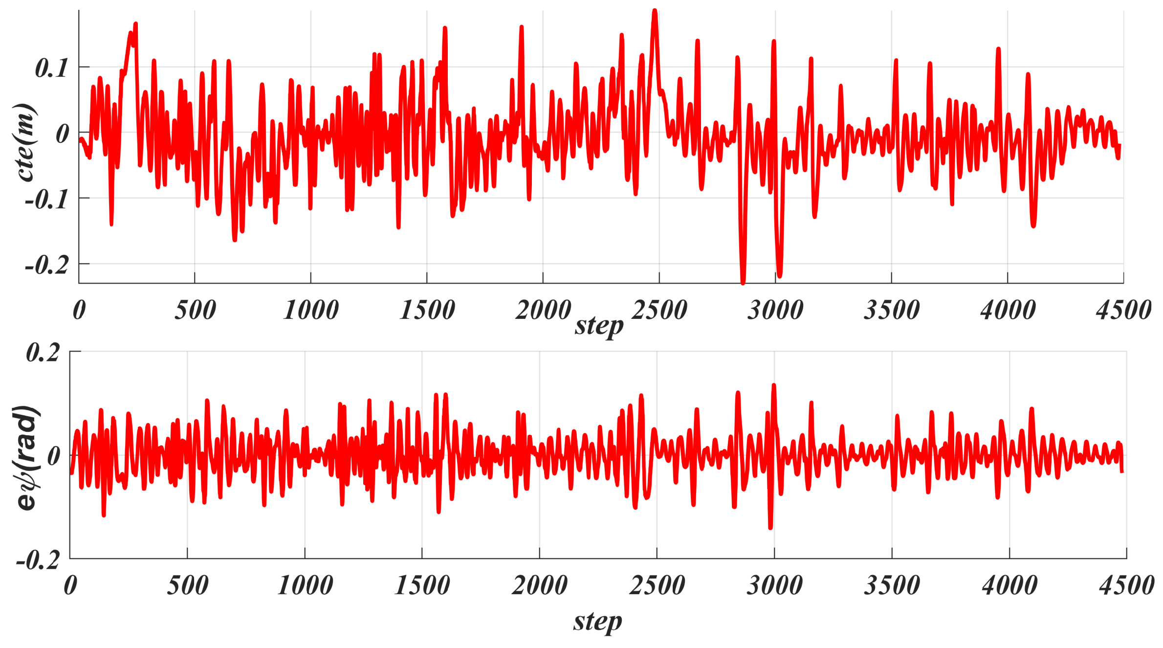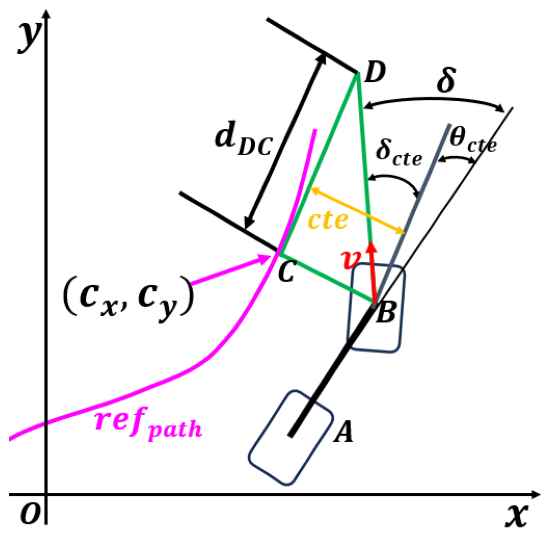 Figure 1 sets the reference point at the center of the front wheel to achieve global convergence in path tracking, and the error decay rate is not affected by the vehicle speed. It ensures heading correction and position error correction, and the generated steering angle remains within the limits of the robot’s dynamics. It acts as a safety net to ensure that the control output is physically feasible and to enhance the system’s robustness to dynamic differences. These considerations ensure the effectiveness and safety of the controller during path tracking.