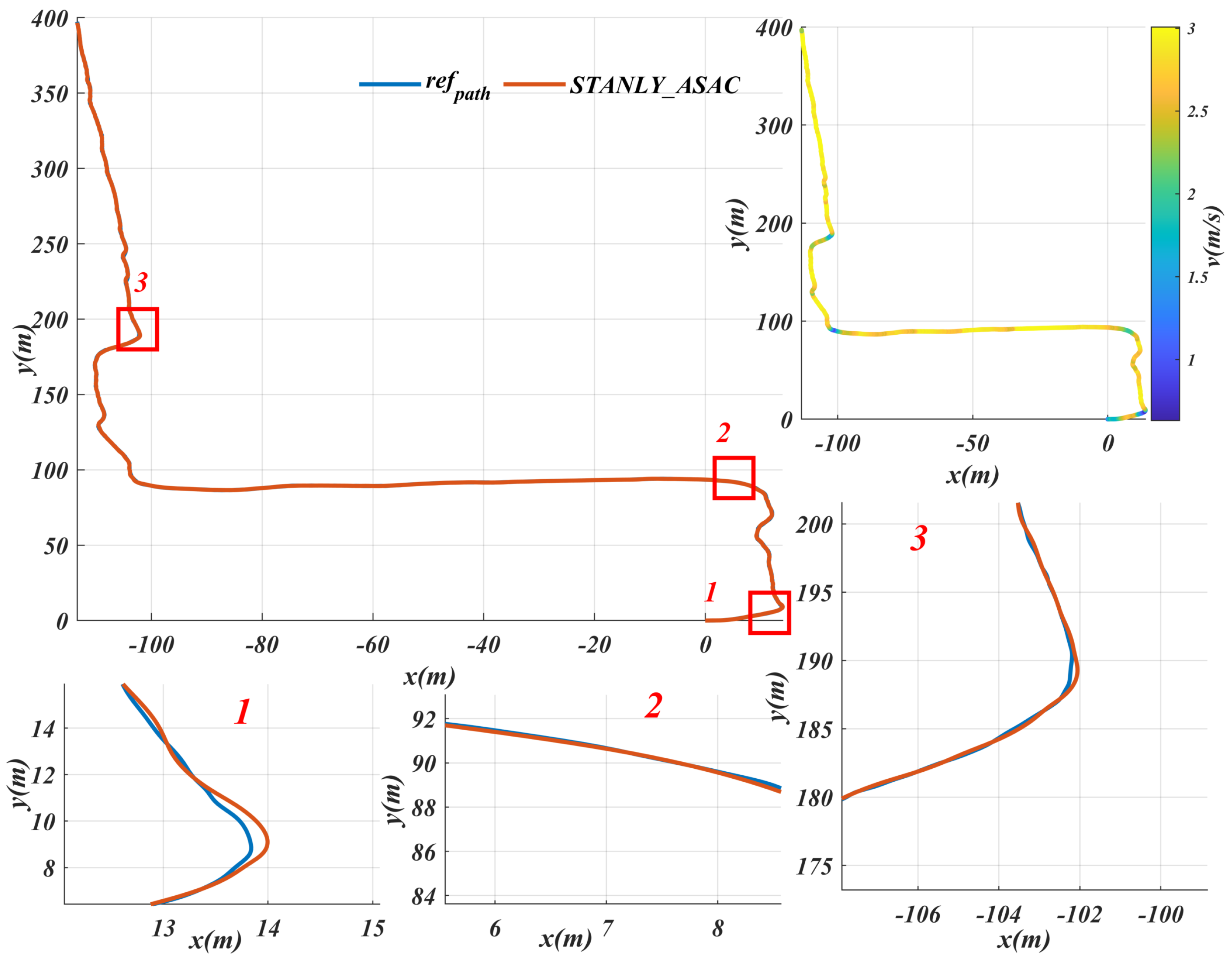 Our STANLY_ASAC controller requires only the nominal values of vehicle parameters, rather than their exact values, to generate optimal acceleration and convert it into speed commands. In addition, the optimal look-ahead distance is adaptively determined by the geometry-based Stanley controller to obtain the optimal front wheel angle, which greatly reduces computational load and improves tracking efficiency.