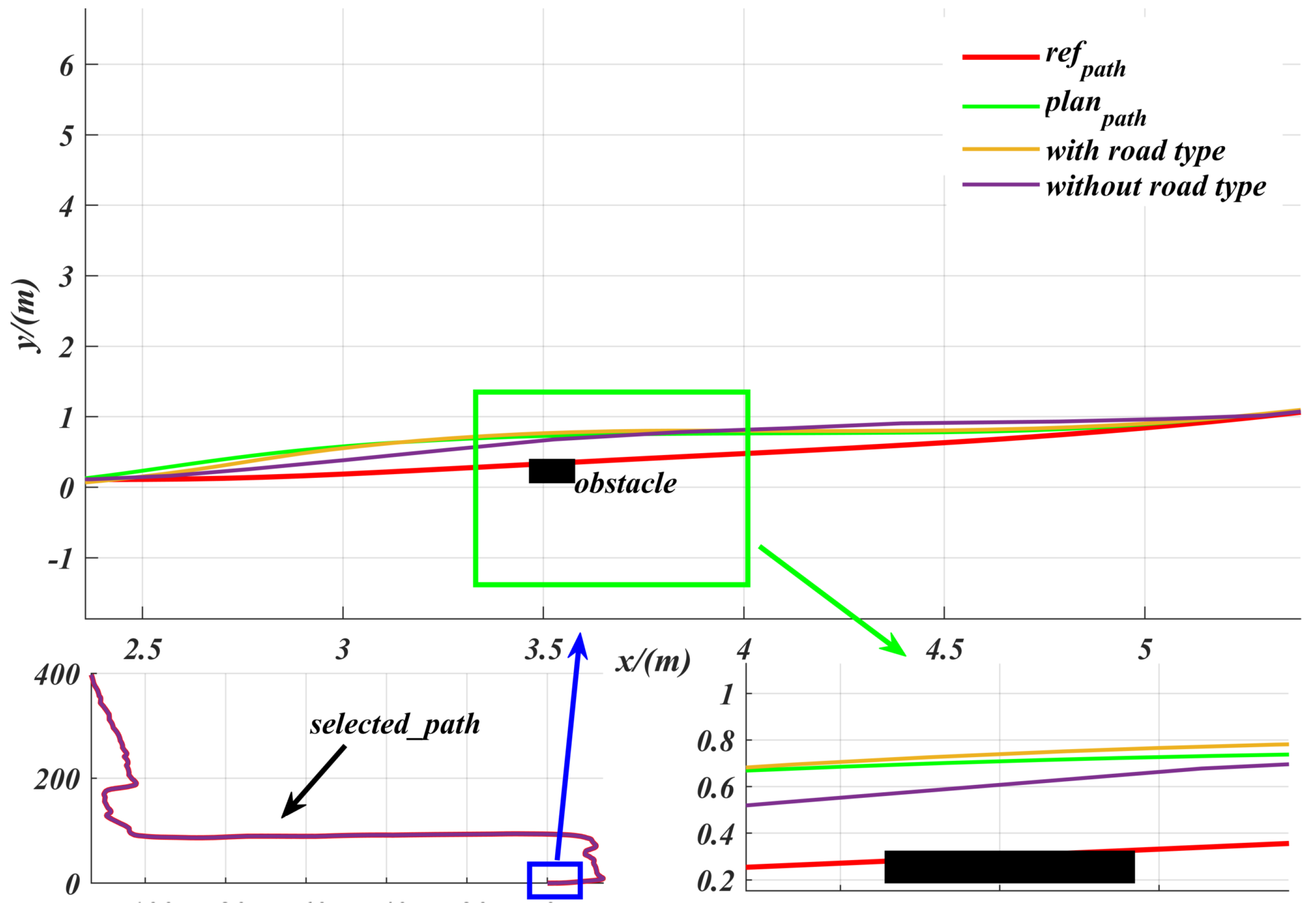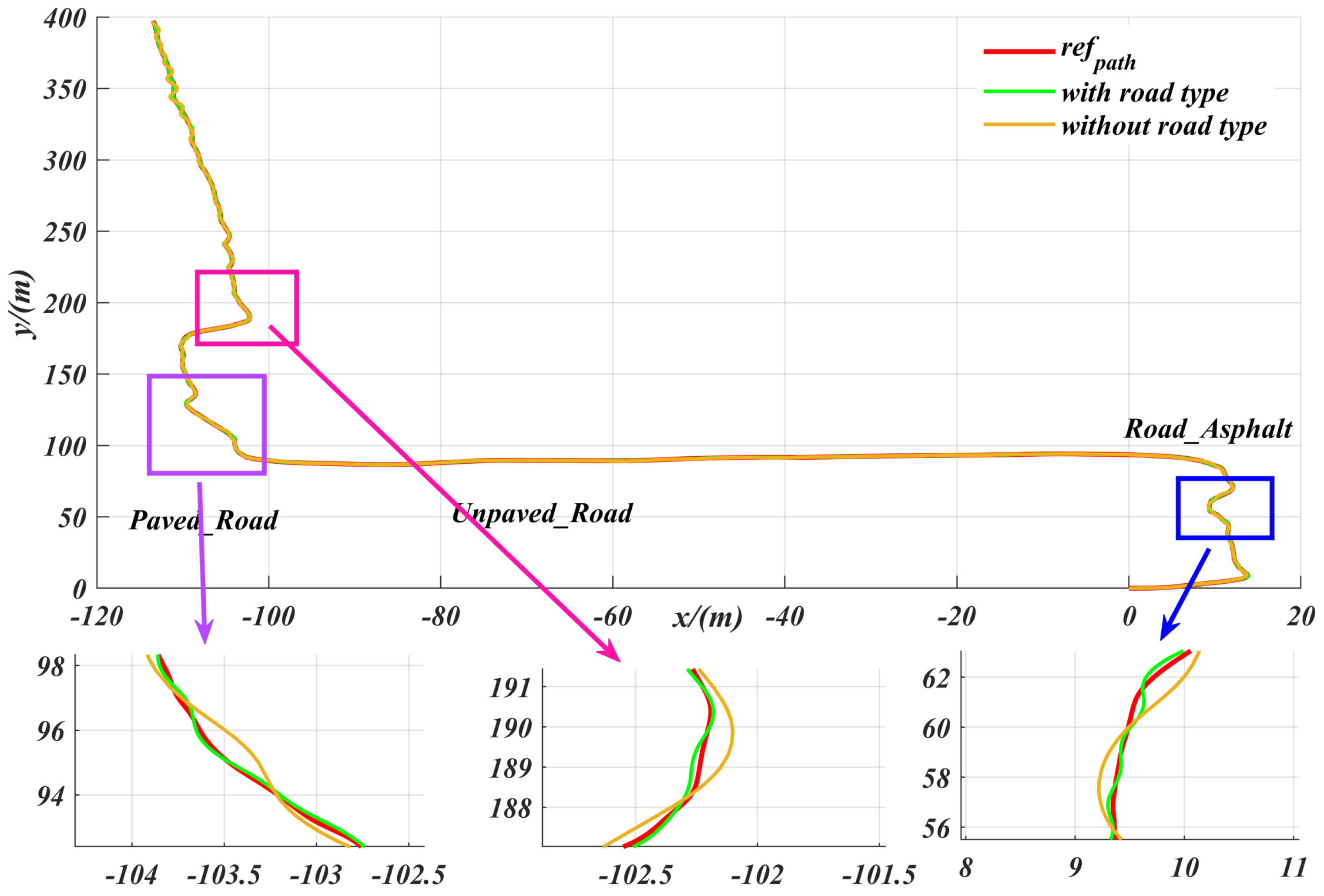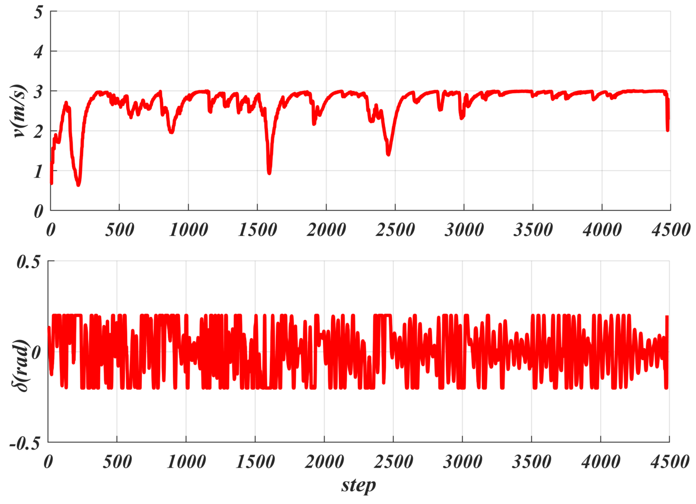 16] adopted a reaction-based method to generate a path and used the pure-pursuit (PP) algorithm to achieve accurate path tracking. However, this study involved iterative optimization, which increased computational time and affected the real-time performance of the robot. In addition, the influence of road conditions and disturbances was not considered in the path-tracking process. Y. Tian et al. used important state information as input for reinforcement learning (RL) during the training process [