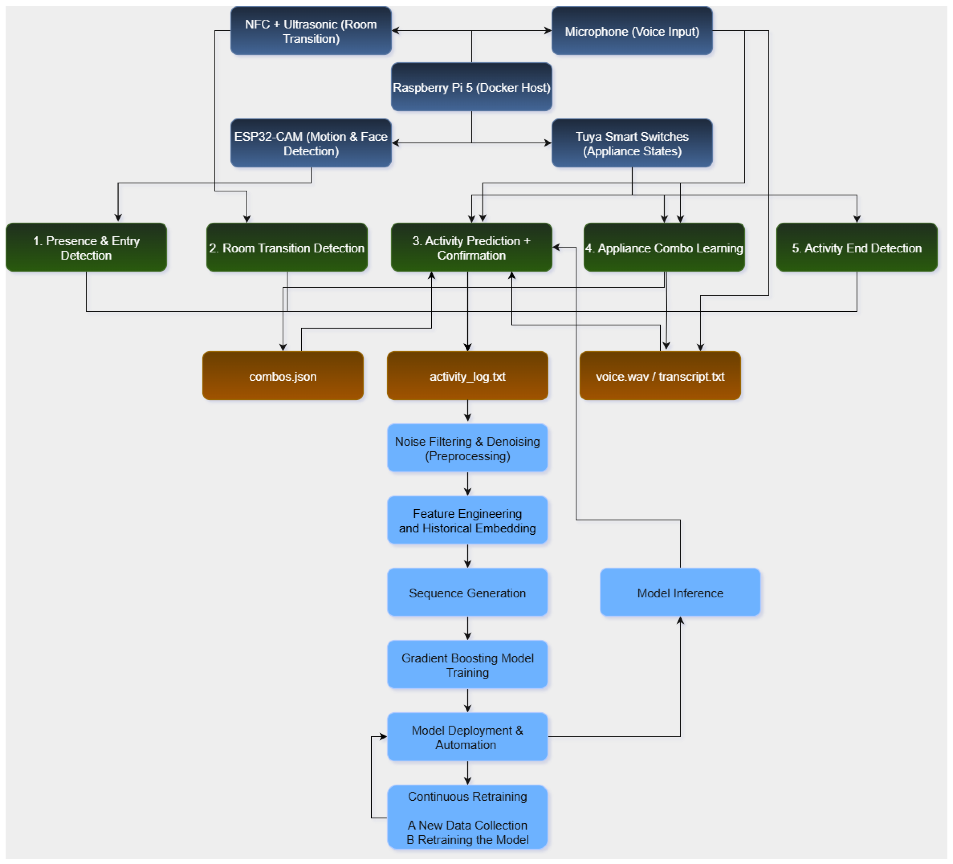 3] is employed for model training and evaluation; however, the system architecture includes physical sensor deployments such as facial recognition modules, NFC tags, ultrasonic presence sensors, and smart switches—to emulate realistic residential scenarios. These components collectively form a prototype environment capable of recording, labeling, and responding to user activities, thereby laying the foundation for future datasets based on real-time, in-home deployments.