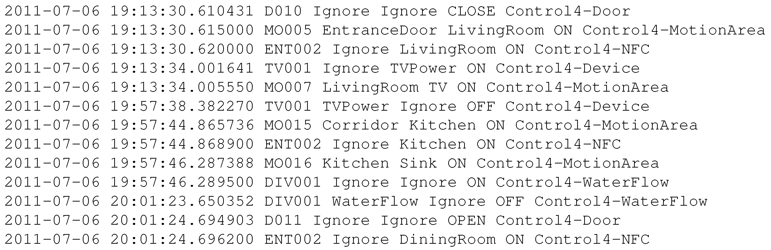 Fabricated raw sensor log with mixed, low-level device events.