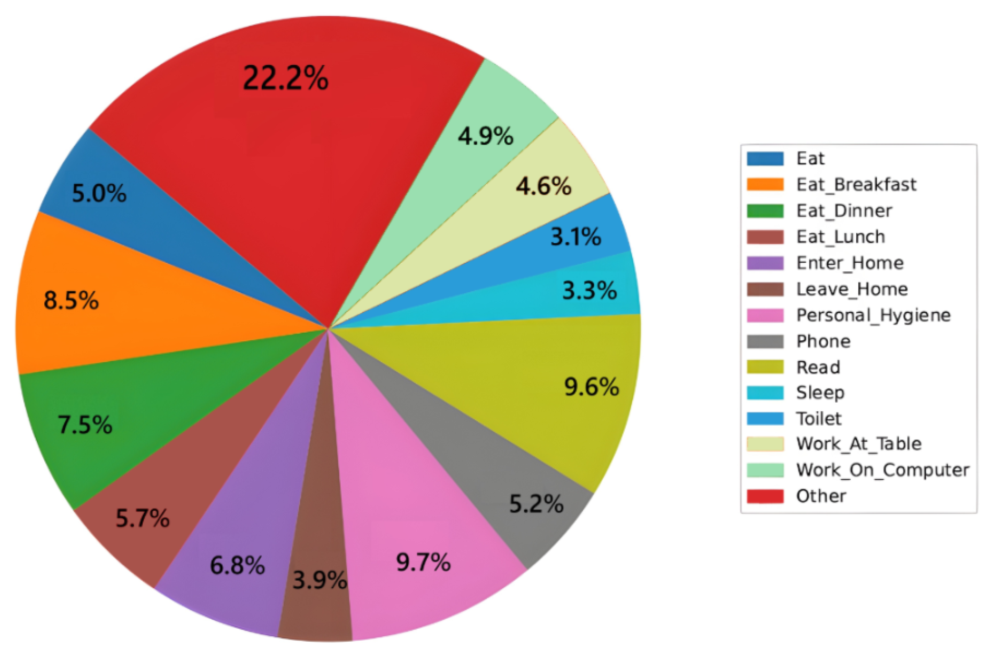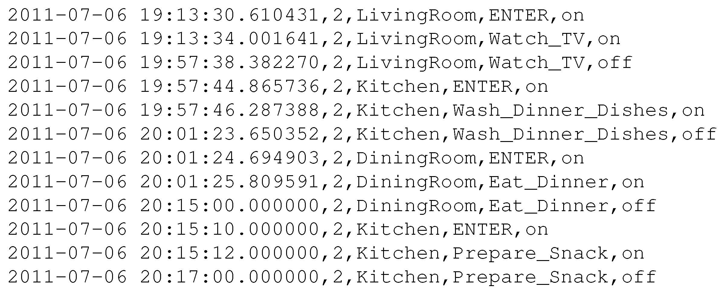 After discarding the three noisy classes, each household’s log was reduced to events with well-defined activities (e.g., Sleep, Cooking, Watch_TV, etc.).