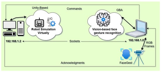 In summary, while these Transformer- and attention-based methods achieve high accuracy, they often suffer from high computational cost, limited generalization to unconstrained environments, and challenges for real-time HCI deployment. Significant progress has been made in both sensor-assisted and vision-based FGR. Still, real-time deployment in interactive systems, especially in immersive environments, remains challenging due to factors such as varying lighting, diverse user characteristics, and the need for low-latency inference [3,6,26]. To advance the state of the art in practical applications, we propose GBA, a lightweight vision-based FGR system integrated into a 3D Unity simulation environment for real-time robot control. The system operates without specialized sensors, mapping recognized facial gestures to control commands transmitted over network sockets between machines, enabling a seamless and contactless human–robot interaction experience.
