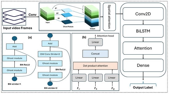 Architecture of the proposed GhostNet-BiLSTM with attention (GBA) model, illustrating spatial feature extraction with GhostNet, spatial and temporal attention mechanisms, and temporal modeling via BiLSTM. Panel (a) shows GhostNet bottlenecks with strides 1 and 2; and panel (b) depicts the attention heads.