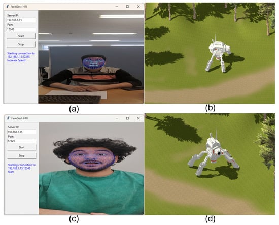 Simulation environment for gesture-based robot control. (a) GUI of the FGR (GBA) system showing Subject A performing a ‘raise eyebrows’ gesture. (b) Robots receive and execute the corresponding command. (c) Subject B is performing a different facial gesture. (d) Robot executing the corresponding command, demonstrating real-time interaction.