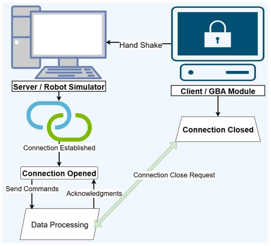 In our proposed system, the 3D Unity simulator acts as the server, while the FGR (GBA) module functions as the client, as shown in Figure 4. For each command, the client establishes a connection and sends a request to the server. The messaging protocol and key parameters are detailed in Table 2. Upon receiving a command from the FGR module, the server sends an acknowledgment and forwards the command to the robot for execution, ensuring accurate and real-time operation.