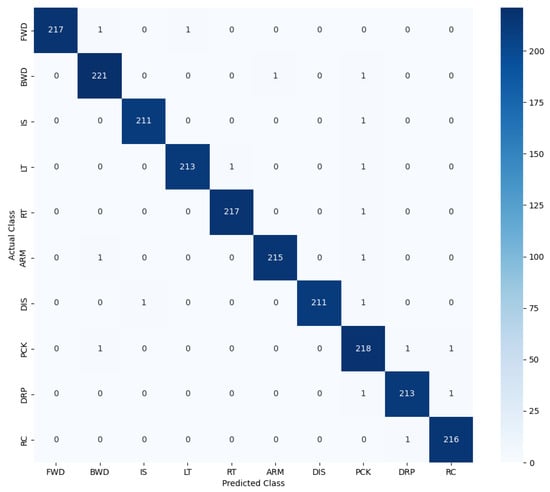 In our experiments, 10 facial gesture classes were considered, with a total of approximately 15,000 video samples, averaging around 1100 samples per gesture. For each class, 80% of the samples (approximately 880 videos) were used for training, while the remaining 20% (approximately 220 videos) were allocated for testing/validation. Following standard evaluation protocols, we employed a five-fold cross-validation approach, ensuring balanced class distributions across all folds. Table 3 and Table 4 summarize the dataset and command mapping information. Specifically, Table 3 presents the number of training and test samples for each gesture class, while Table 4 lists the gesture class names along with their mapped control commands and class abbreviations.