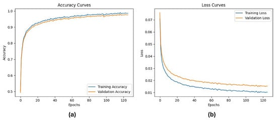 The proposed system was evaluated using a cross-platform client–server configuration. The Unity-based 3D simulation environment acted as the server and was deployed on a Windows 11 Home workstation (HP Pavilion Gaming Desktop TG01-1xxx, HP Inc., Palo Alto, CA, USA) equipped with an Intel® Core™ i5-10400F CPU at 2.90 GHz, 32 GB of RAM, and a Realtek Gaming GbE network interface. This server maintained a TCP socket connection to receive gesture commands from the remote client, acknowledged each command, and updated the virtual environment in real time, enabling responsive simulation control. The client consisted of the FGR module (GBA), which was trained and executed on an Ubuntu 22.04.5 LTS workstation with a 3.50 GHz Intel Core i9-10920X CPU, dual NVIDIA GeForce RTX 3090 GPUs, and 32 GB of RAM. The model was trained for 350 epochs with early stopping enabled. Categorical cross-entropy was used as the loss function, and the Adam optimizer was employed for optimal weight updates. The tanh activation function was used in the BiLSTM layers, while softmax activation was applied at the final output layer for gesture classification.