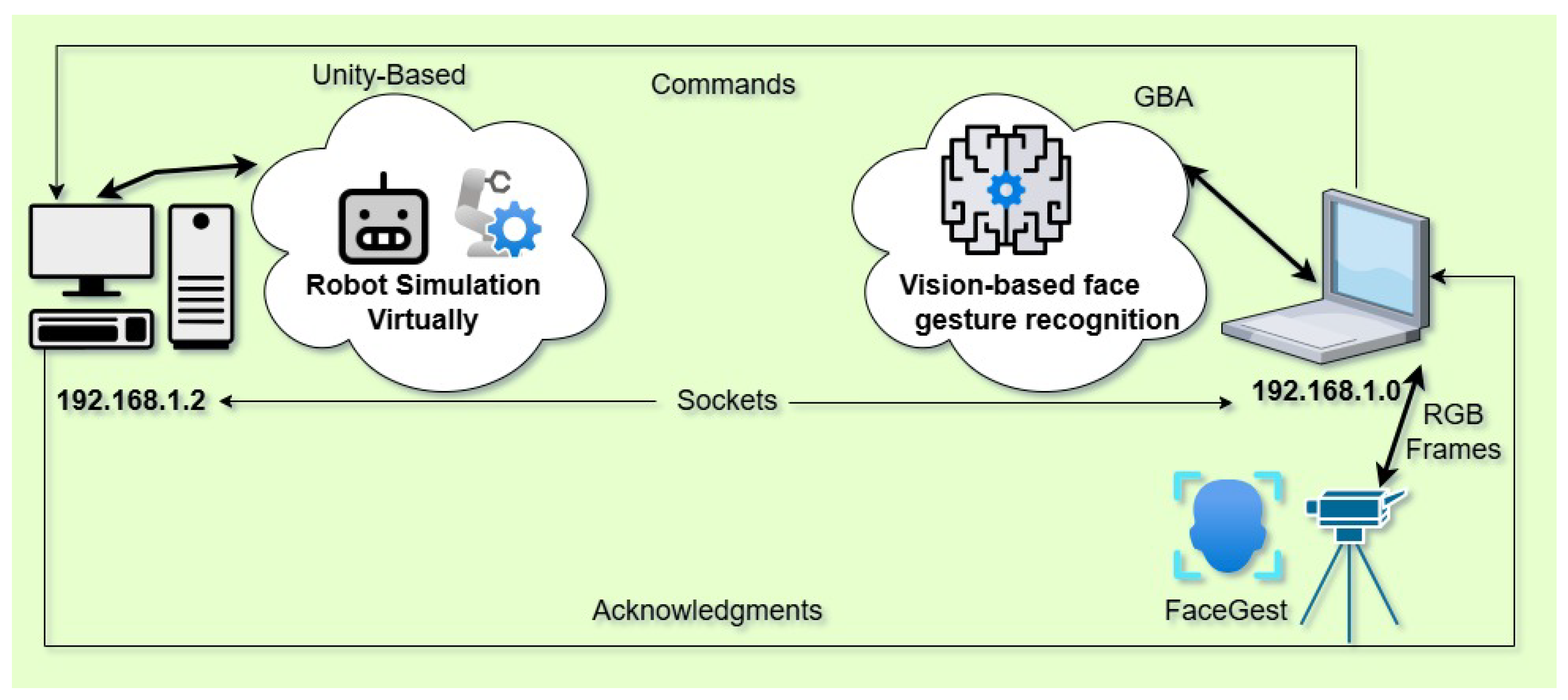 Fifteen subjects participated in testing the proposed system. The FGR (GBA) module was installed on one machine, and the Unity 3D simulator on another, connected through IP addresses as shown in