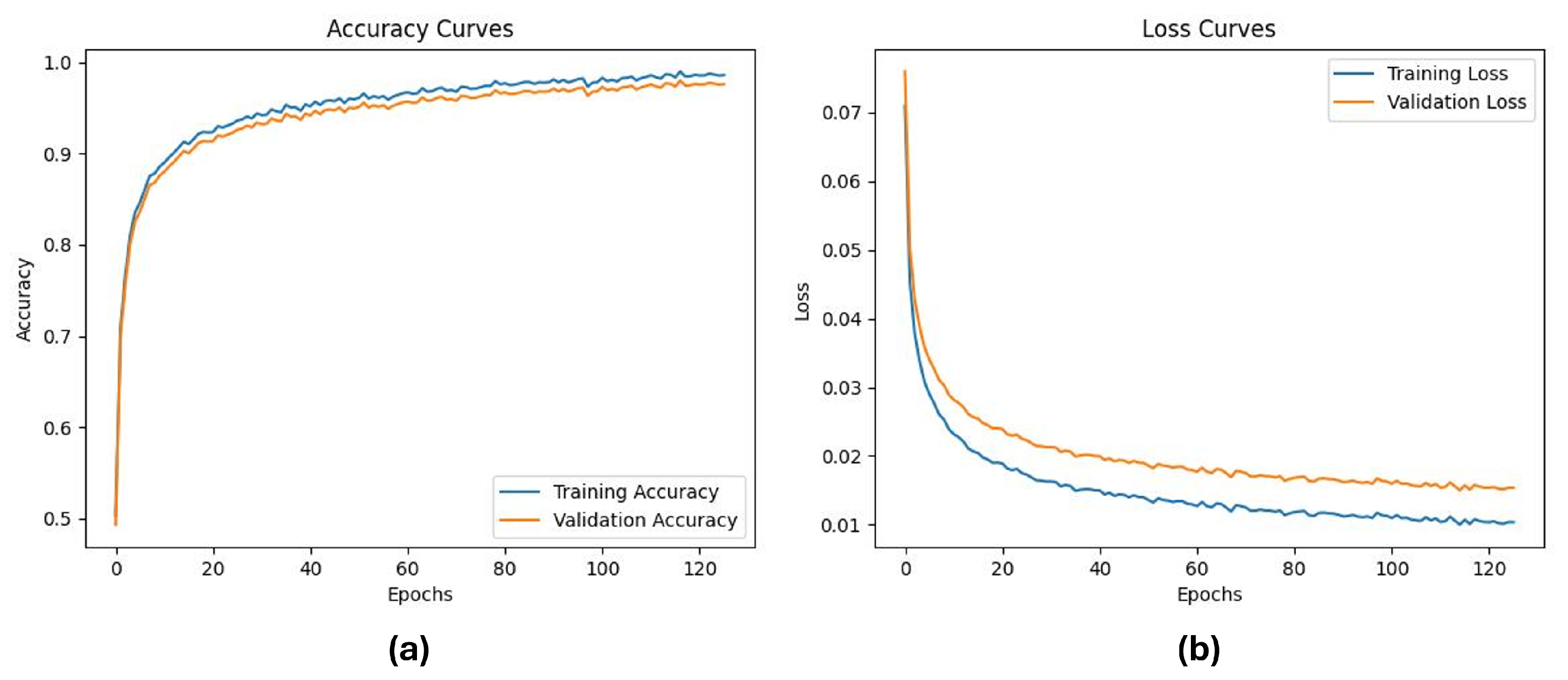 Figure 6b) decreases consistently, indicating smooth convergence without overfitting. These curves confirm the stability of the model training process and support the effectiveness of the proposed architecture for dynamic facial gesture recognition.