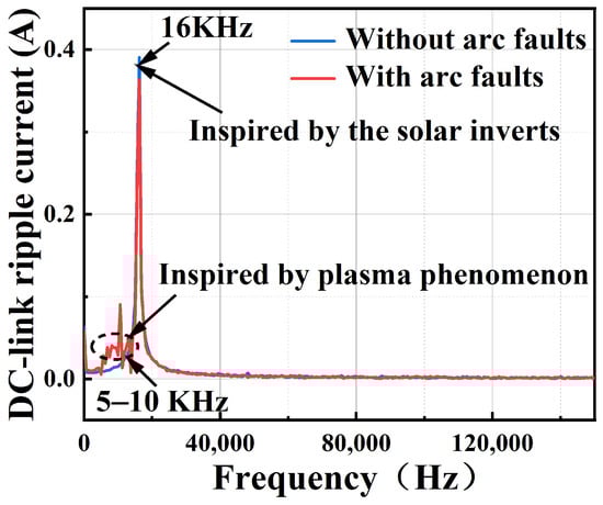 One important global feature of an arc fault is that it is independent of normal signals. In the PV system, the normal DC current signals are inspired by the solar panels, while the arc fault signals are inspired by the plasma phenomenon. This indicates that the physical mechanism of the arc fault and the normal signals are totally different and can be viewed as inspired by independent sources. This can be clarified in Figure 1, whose data is obtained from real-world experiments, where the frequency components of the PV system’s DC-side currents are mainly located in 16 KHz, which is the PWM switching frequency of solar inverts, while the frequency components of arc fault signals are mainly located in 5–10 KHz, as shown by the dashed circle in the Figure 1, which is in line with the principles of randomness of plasma motion.