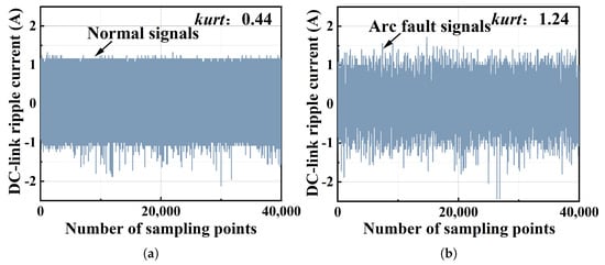The normal PV system signal and the arc fault signal, in which the sampling rate is 1 MHz. (a) The normal PV system signal; the kurtosis value is 0.44. (b) The arc fault signal; the kurtosis value is 1.24.