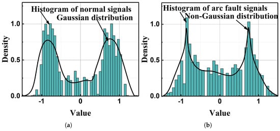 Figure 2 shows the kurtosis value of a normal signal and arc fault signal whose data is obtained from real-world experiments. It can be seen that the kurtosis value of the normal signal is 0.44, while the kurtosis value of the arc signal is 1.24. This indicates that the signal with the arc fault is more likely non-Gaussian. More evidence of the arc fault’s non-Gaussian characteristics is shown in Figure 3 by using histograms, where the normal signal’s distribution is apparently Gaussian, while the arc fault signal’s distribution is non-Gaussian.