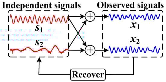 Based on Equation (3), the goal of ICA becomes finding an unmixing matrix that fits the approximation of such that . A brief description is demonstrated in Figure 4.