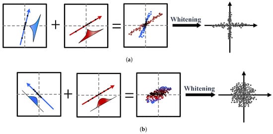 It should be noted that the ICA technique can only decompose non-Gaussian signals, as shown in Figure 5. Specifically, Figure 5a shows that if two non-Gaussian signals are superimposed, the signal whitening indicates that they can be separated by signal whitening. Figure 5b shows that if two Gaussian signals are superimposed, they are overlapped and cannot be separated by signal whitening.