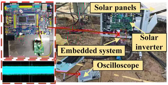 A real-world PV platform is used for performance evaluation. The experimental rig is shown in Figure 6, which consists of a solar inverter for signal generation, an embedded system for signal collection, and an oscilloscope for signal presentation. The solar inverter’s maximum DC voltage is 1500 V, and the maximum DC current is 20 A. The DC-side current is measured by a Hall-effect current sensor manufactured by Sinomags Technology in Bengbu, Anhui, China. The acquired current signals are then transmitted to a microcontroller, where they are converted into digital values by its built-in analog-to-digital converter (ADC). The ADC operates at a conversion rate of 1 Mbps, meaning that one million analog-to-digital conversions are performed per second. In this study, the solar inverter’s DC-side current signals are used and collected to detect DC-side arc faults. The detailed steps are shown below.