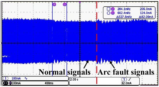 Step 1—Signal generation and collection: The current signals under both arc fault and normal scenarios are collected, respectively, which are shown using an oscilloscope in Figure 7. An embedded system is used for signal collection and calculation. The core MCU of the embedded system is STM32H743ZIT6, and the sampling rate is 1 Mbps.