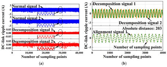 One unique advantage of our method is robustness. In order to verify this, experiments were conducted under external environmental disturbance, which would most likely lead to false alarms for arc faults. To verify whether our method can distinguish between external environmental disturbance and arc faults, normal signals were collected under an external environmental disturbance scenario and input to the method. The experimental results are shown in Figure 11, where Figure 11a shows the results of the ICA output and Figure 11b shows the results of DTW. It can be seen in Figure 11 that the absolute distance is 319, which is less than the threshold of 1000 and does not mistake external environmental disturbance signals for arc fault signals. This is because the disturbance from the external environment is Gaussian in terms of a high-frequency manner. According to the analysis in Section 4, the Gaussian signal cannot be decomposed by ICA. This showcases that our method is robust against Gaussian noise such as in terms of grid energy fluctuation. Furthermore, while dynamic load and weather changes impact the accuracy of traditional methods like CNNs, our method is unaffected by these factors due to its basis in source independence.