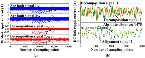 The detection results of the arc fault signal when the PV system DC is 6 A: (a) the results of DTW when the PV system DC is 6 A; (b) the results of DTW when the PV system DC is 6 A.