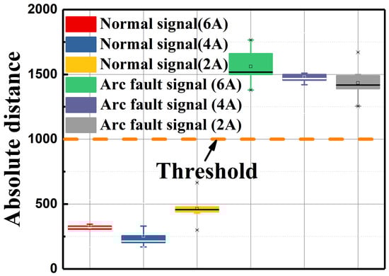 In order to determine the proper DTW distance threshold under different current levels, 50 sets of experiments were repeated at 6A, 4 A, and 2 A DC-side currents, respectively. The box plot is shown in Figure 10, where the normal signals’ DTW distance is between 100 and 400 and the arc fault signals’ DTW distance is between 1200 and 1800. Thus, in this study, we set the DTW distance to 1000 as an empirical threshold.