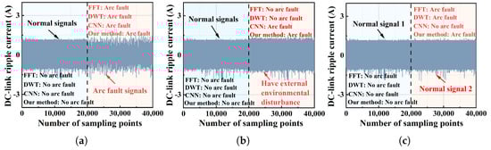 Comparative experiments were conducted under the three following scenarios: 1. arc faults; 2. external environmental disturbance; and 3. normal signals but at different moments. Figure 12a shows the results of arc faults; it can be seen that four methods can be detected correctly. This is because the arc faults are significant and can be easily detected. Figure 12b shows the results of external environmental disturbance. It can be seen that the FFT and DWT methods failed to detect arc faults. This is because there are high-frequency components superimposed when an external environmental disturbance is present, which may lead to a false alarm if frequency-based methods are used. Figure 12c shows the results of normal signals at different moments. It can be seen that the CNN method causes a fault alarm. This is because the accuracy of the CNN method depends on the quality of data and is limited by low interperability and low generalization.