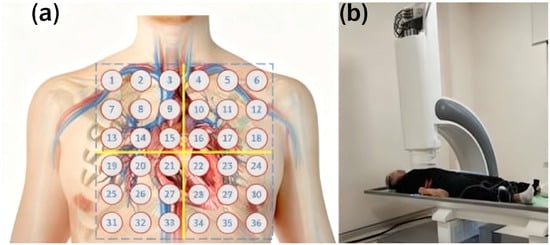 (a) Measurement points of magnetocardiography; (b) Measurement process of 9-channel magnetocardiography.