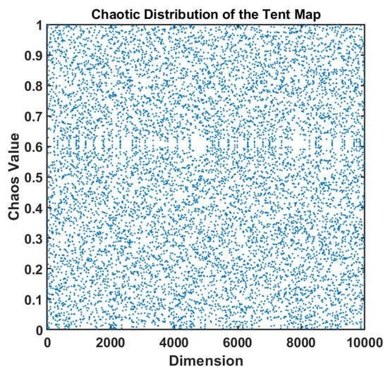 As shown in Figure 3, in the scatter plot of the chaotic mapping, the horizontal axis represents the dimension and the vertical axis represents the chaotic value. The data points in the figure are evenly distributed without obvious patterns, showing typical chaotic characteristics, which indicates that the mapping function has strong randomness and ergodicity.