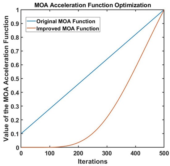 The comparison effect between the improved MOA function and the original MOA function is shown in Figure 4. Compared with the linear MOA function, the nonlinear MOA function proposed in this work shows better performance in the algorithm. It can be seen from the figure that as the number of evolutionary iterations gradually increases, the linear MOA function grows at a constant rate, while the nonlinear MOA function grows more slowly in the early stage. This effectively avoids the local optimal trap caused by too fast convergence in the early stage of the search, enabling the algorithm to have stronger global exploration ability. With the deepening of iterations, the nonlinear MOA function accelerates its growth and reaches the same final value as the linear MOA in the later stage, thereby enhancing the local search ability of the algorithm and improving the convergence accuracy and optimization efficiency. This improvement allows the algorithm to dynamically adjust the search step size at different stages, improving the local convergence accuracy while maintaining the global search ability, making the optimization effect more stable and reliable.