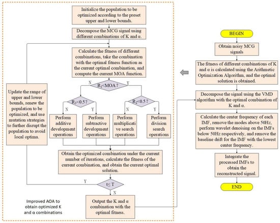 Magnetocardiography (MCG) offers a noninvasive method for early screening and precise localization of cardiovascular diseases by measuring picotesla-level weak magnetic fields induced by cardiac electrical activity. However, in unshielded magnetic environments, geomagnetic disturbances, power-frequency electromagnetic interference, and physiological/motion artifacts can significantly overwhelm effective magnetocardiographic components. To address this challenge, this paper systematically constructs an integrated denoising framework, termed “AOA-VMD-WT”. In this approach, the Arithmetic Optimization Algorithm (AOA) adaptively optimizes the key parameters (decomposition level K and penalty factor α) of Variational Mode Decomposition (VMD). The decomposed components are then regularized based on their modal center frequencies: components with frequencies ≥50 Hz are directly suppressed; those with frequencies <50 Hz undergo wavelet threshold (WT) denoising; and those with frequencies <0.5 Hz undergo baseline correction. The purified signal is subsequently reconstructed. For quantitative evaluation, we designed performance indicators including QRS amplitude retention rate, high/low frequency suppression amount, and spectral entropy. Further comparisons are made with baseline methods such as FIR and wavelet soft/hard thresholds. Experimental results on multiple sets of measured MCG data demonstrate that the proposed method achieves an average improvement of approximately 8–15 dB in high-frequency suppression, 2–8 dB in low-frequency suppression, and a decrease in spectral entropy ranging from 0.1 to 0.6 without compromising QRS amplitude. Additionally, the parameter optimization exhibits high stability. These findings suggest that the proposed framework provides engineerable algorithmic support for stable MCG measurement in ordinary clinic scenarios.