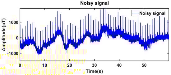 To evaluate the practical performance of the proposed method, continuous MCG detection of the human heart was performed for 60 s under open and low-noise conditions, with a sampling frequency of 1 kHz. The measured signal is shown in Figure 6. In the process of population optimization, the populations size per iteration is set to 60, and the maximum number of iterations is set to 50. The ranges of parameters K and α are set to K ∈ [4, 10] and α ∈ [500, 3000].