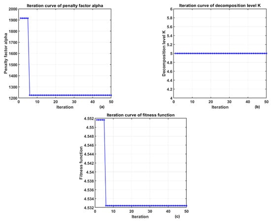 The change in VMD parameters optimized by AOA. (a) Iteration Curve of the Penalty Factor (b) Iteration Curve of the Decomposition Level (c) Iteration Curve of the Fitness Function.