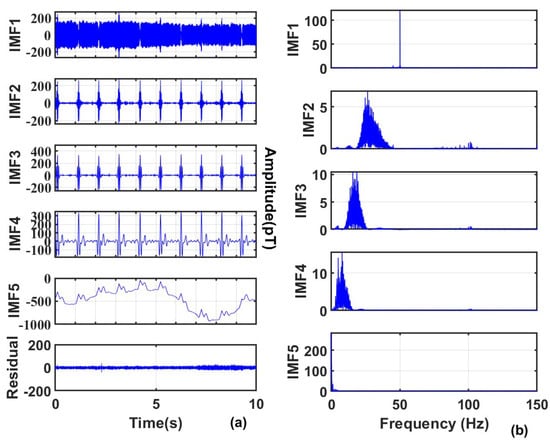 To more intuitively show the denoising effect, this work selected the real-time MCG data of the human body from 0 to 10 s for analysis, and the decomposition results are shown in Figure 8.