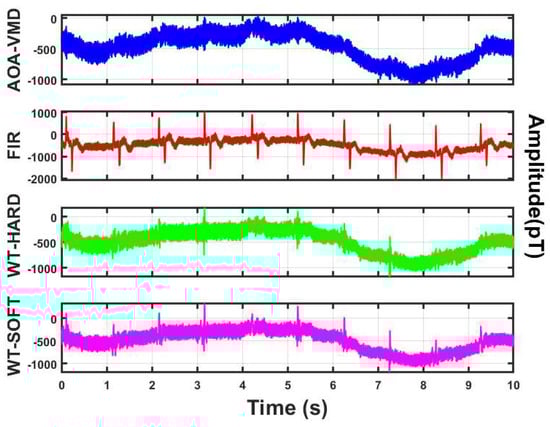 The method adopted in this work is compared with other algorithms, and a denoising experiment is conducted on the measured MCG data. The denoising effect is shown in Figure 12.