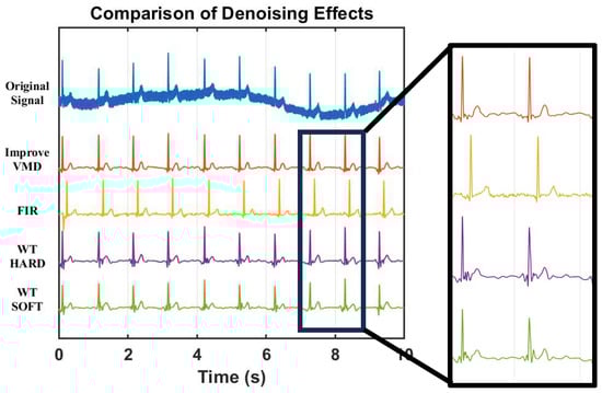 It is found through comparative experiments that the signals processed by other algorithms still have a lot of residual noise, and the amplitude of the R peak is reduced after denoising. The reduction degree of the soft threshold processing is more obvious than that of the hard threshold.