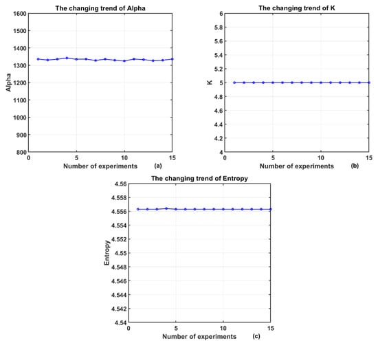 Results of multiple experiments on the same signal: (a) The changing trend of Alpha; (b) The changing trend of K; (c) The changing trend of Entropy.