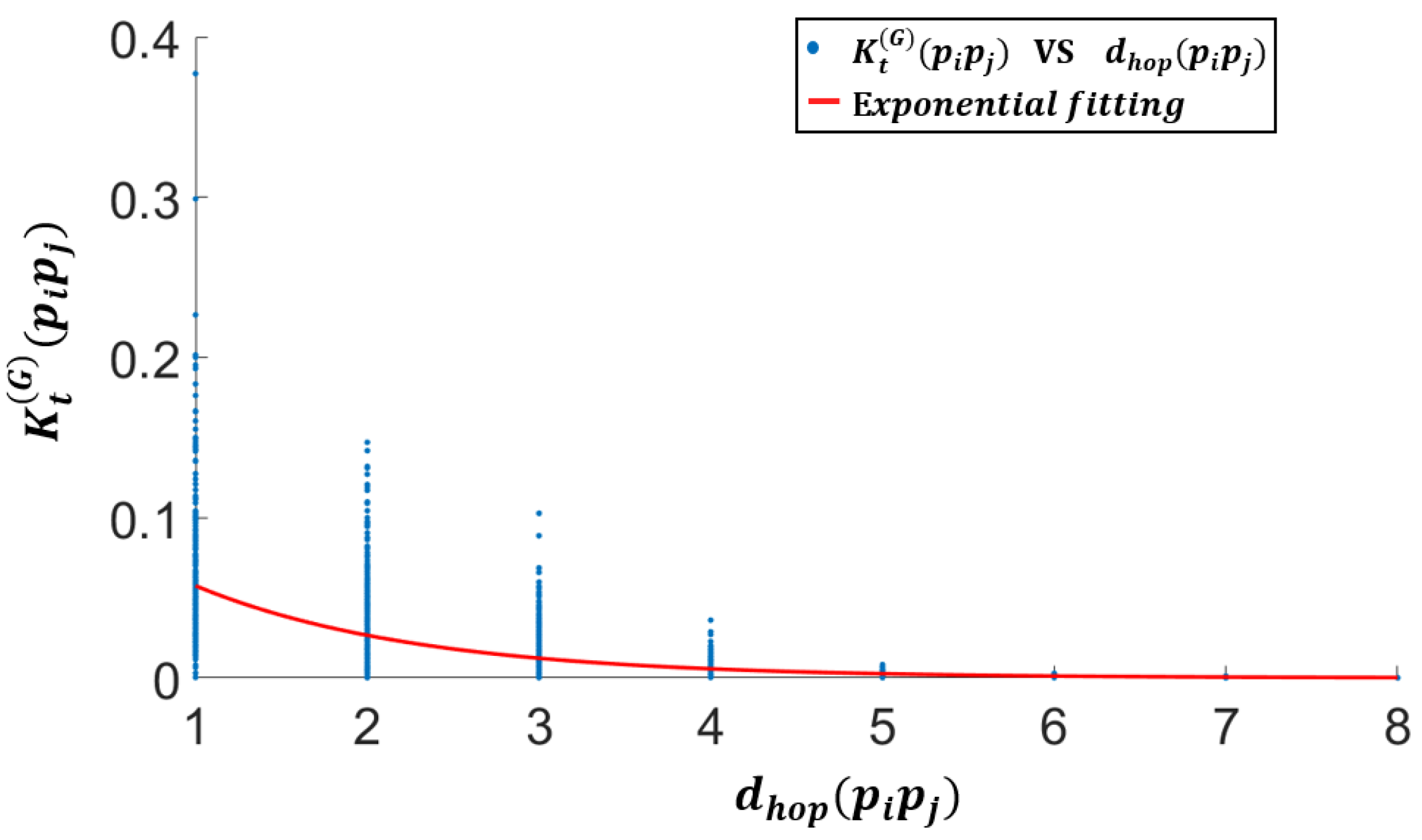 Figure 7 also shows a first-order exponential approximation of the underlying relationship. We observe a trend of exponential decay of the heat diffusion kernel