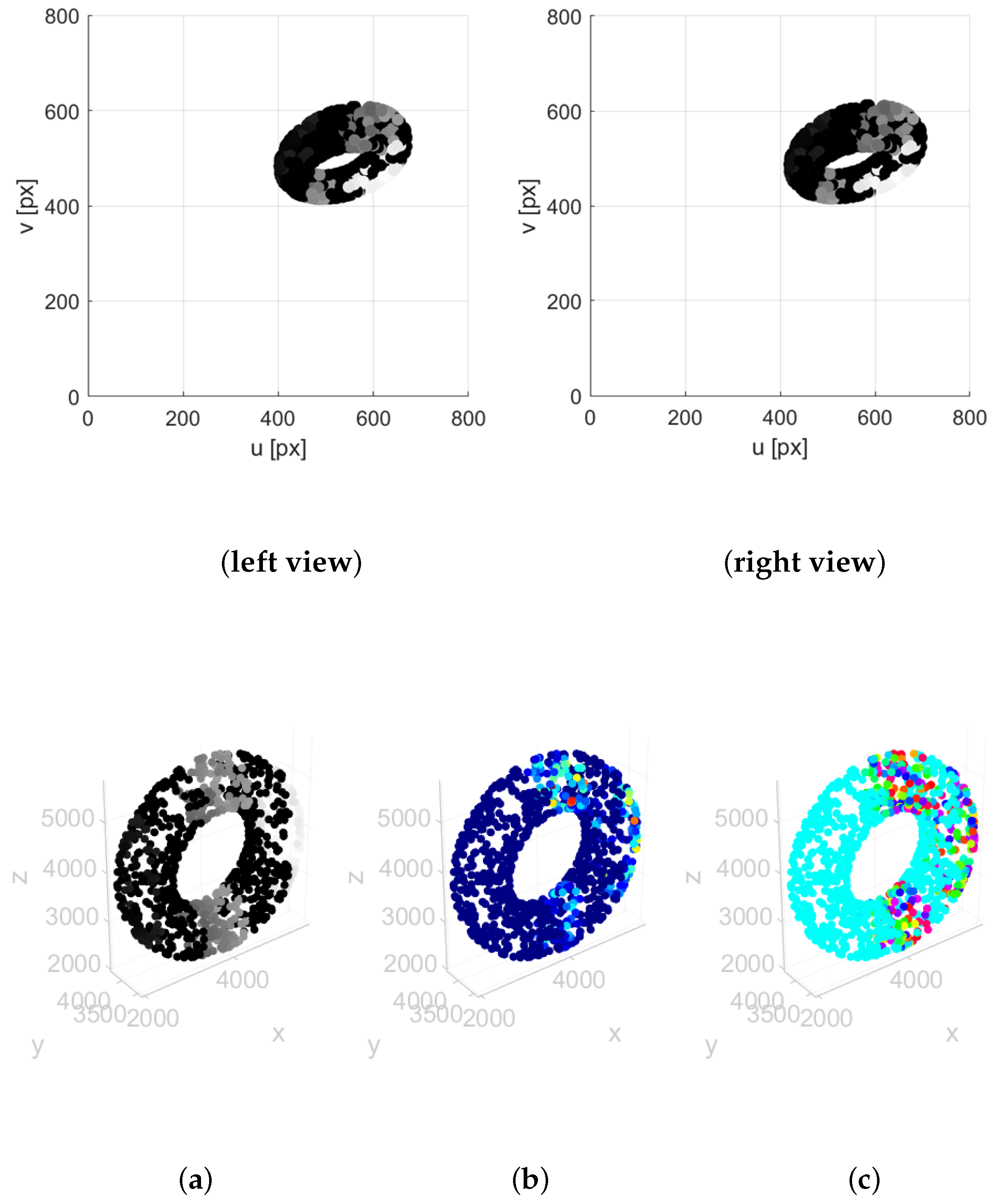 7], with the following settings: (i) the focal length of the cameras was 387.77 pixels for both x- and y- axes; (ii) the principal point of the cameras was located at coordinates (257.446, 197.718), specified in pixels; (iii) the maximum horizontal displacement between keypoints was limited to 48 pixels in order to filter matches that could lead to excessively shallow depth once triangulation is performed. By leveraging geometric constraints and correspondences between the two views, we inferred the spatial position of the points on the original 3D surface as in [