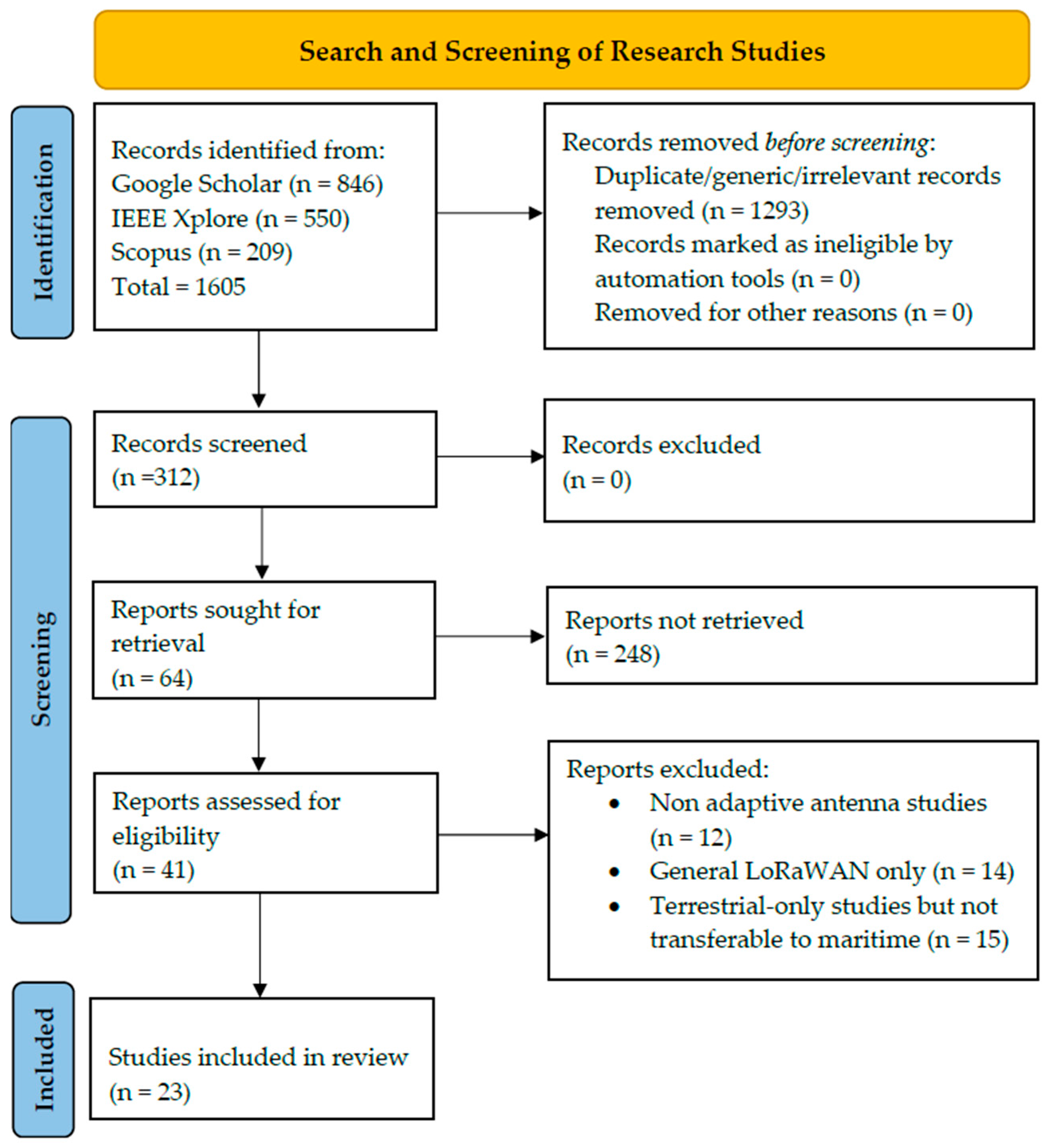- Studies that investigated general LoRaWAN and adaptive antenna were included if they provided transferable insights into maritime deployments.