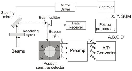 As a result, three voltage signals (Ex, Ey, and SUM) are generated. The SUM signal compensates for light fluctuations caused by instabilities in the radiation source or atmospheric effects such as scintillations. Figure 2 shows the schematic of the beam position unit [11]. The voltage signals represent the horizontal Ex and vertical Ey deviation of the transmitter position, respectively: