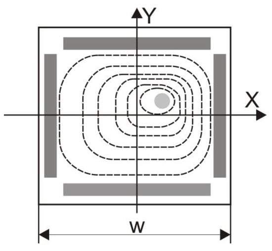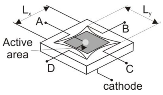 In contrast, the TL-PSD employs a single resistive layer with a common cathode and anode on each side of the detection area. While this design reduces production costs, it compromises response linearity, particularly away from the detector center. This decline results from the placement of the anodes along the detector edge [14]. The electrostatic field in the detector generated by the charge Q is equal to [15]