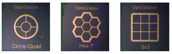 A similar design is described in detail in [33]. It employs InAlAs/InGaAs APD arrays with various geometries (Figure 5). Each array consists of elements 100 µm in diameter, with a minimum optical fill factor of 80%. In laboratory tests using a 1550 nm laser, the central pixel of the circle-quad configuration exhibited a sensitivity of −42.2 dBm for a bit error rate of 2 × 10−9 and a data rate of 155 Mbps.