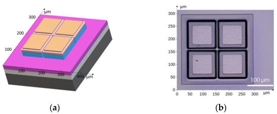 (a) Schematic diagram of the four-channel photodiode used in the IR detection module; (b) photograph of the edged mesa structure.